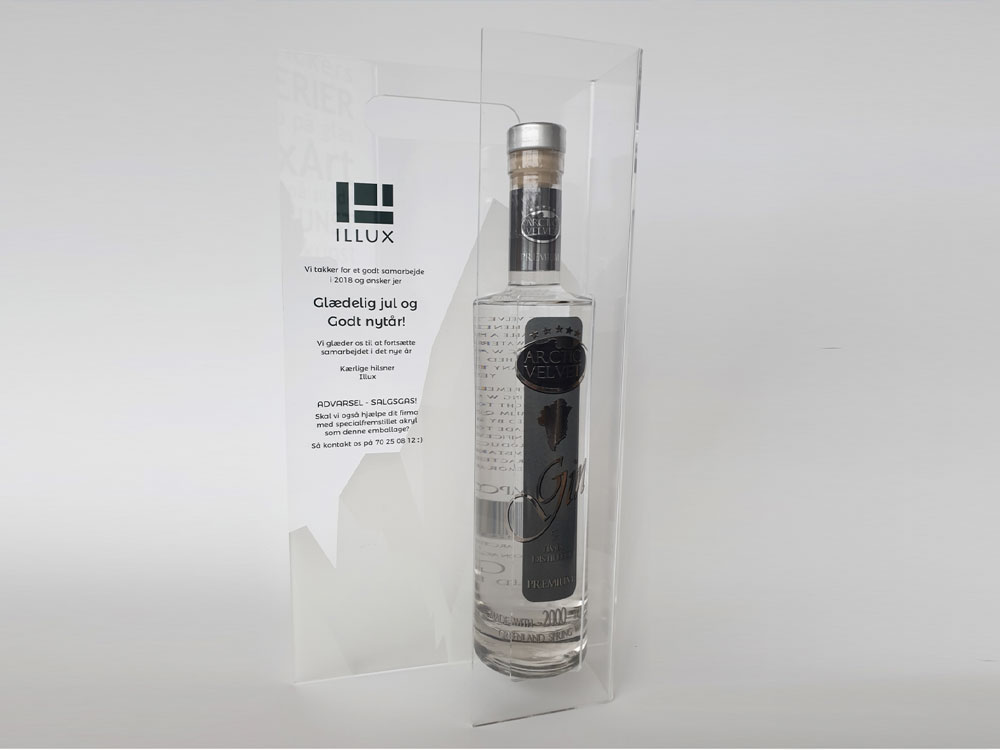 Den eksklusive flaskestativet ble laget for Illux A/S og skulle brukes som julegave til deres kunder og samarbeidspartnere. Dette er et spesiallaget flaskestativ, produsert i 3 mm akryl.