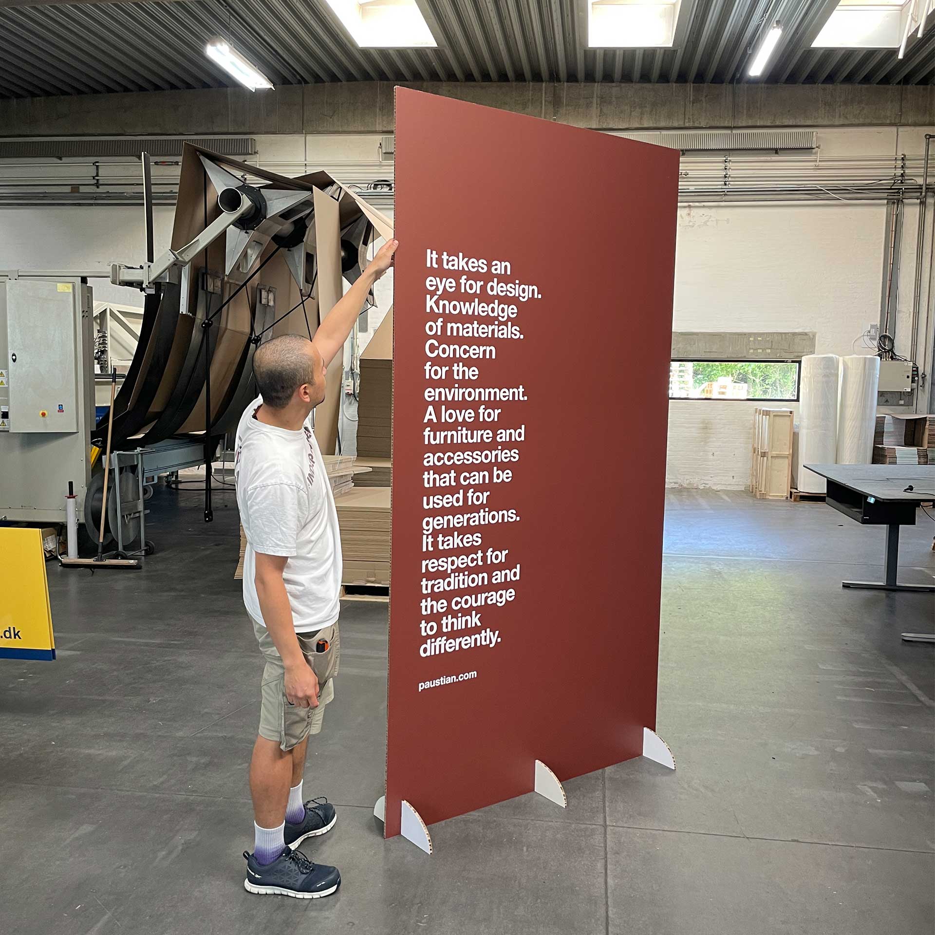 Takket være den smarte konstruksjonen med medfølgende pappføtter (35x12 cm), er skiltet enkelt å transportere, sette opp og flytte rundt. Husk at viktig grafikk bør plasseres over de nederste 12 cm, da føttene dekker dette området. Skilt under 100 cm bredde leveres med 2 føtter, mens skilt over 100 cm leveres med 3 føtter. Skiltet står stabilt på gulvet, men kan like gjerne brukes som borddisplay eller som en del av en messestand – alt etter behov.