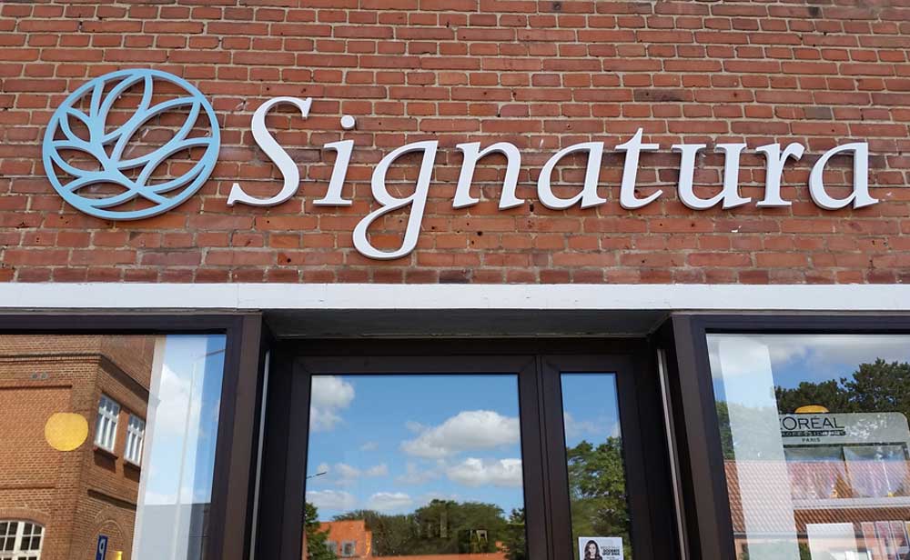 Fasadelogoen svever 16 mm fra veggen ved et lite skilt og 25 mm ved et stort skilt.