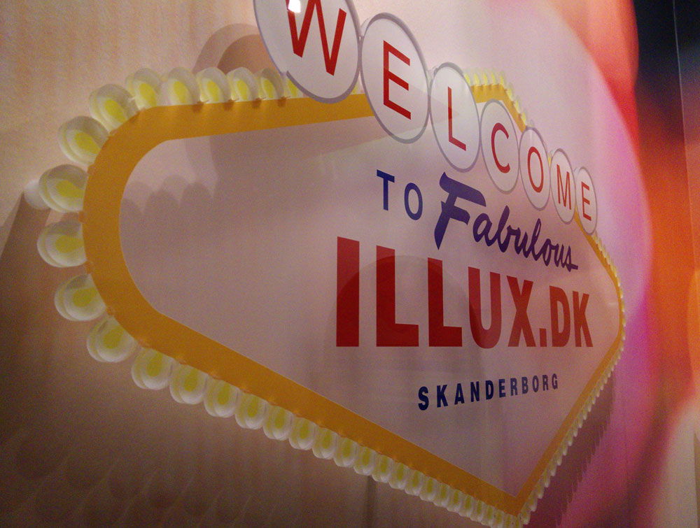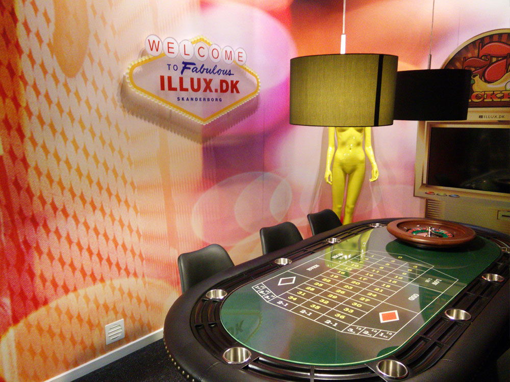 For Illux A/S har vi designet og innredet et møterom i ekte Las Vegas-stil. Her er det lagt til rette for en mer uformell og avslappet atmosfære i et hyggelig miljø. Skiltet som henger på veggen er laget i 10 mm akryl, utskåret og montert med avstandsstykker. Vi har også tapetsert hele rommet med vårt tapettrykk, som er svært enkelt å montere og gir et personlig og stilfullt uttrykk. På bakveggen har vi laget et spesialdesignet 3 mm aluminiumsskilt som forestiller en spilleautomat, utskåret slik at det passer perfekt rundt TV-en i rommet.