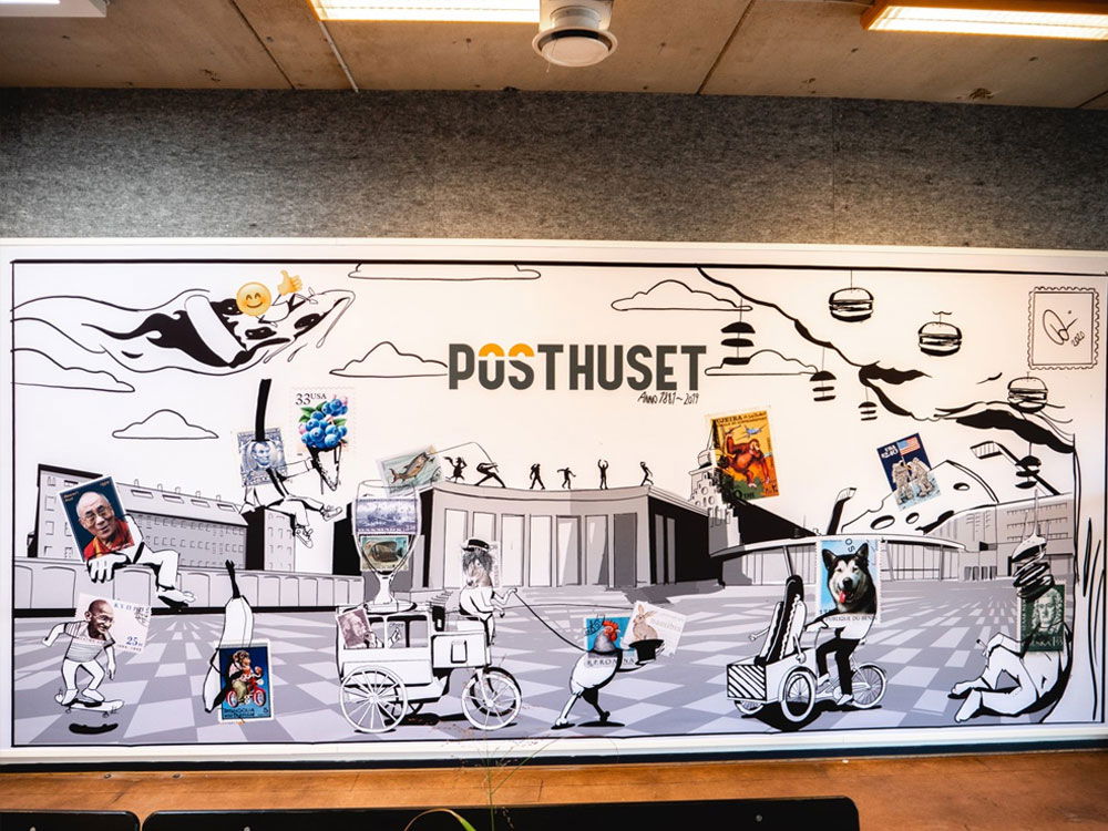 Til Posthuset i Horsens har vi levert et stort tekstilbanner trykket med humoristiske tegneseriestriper og