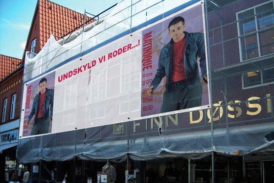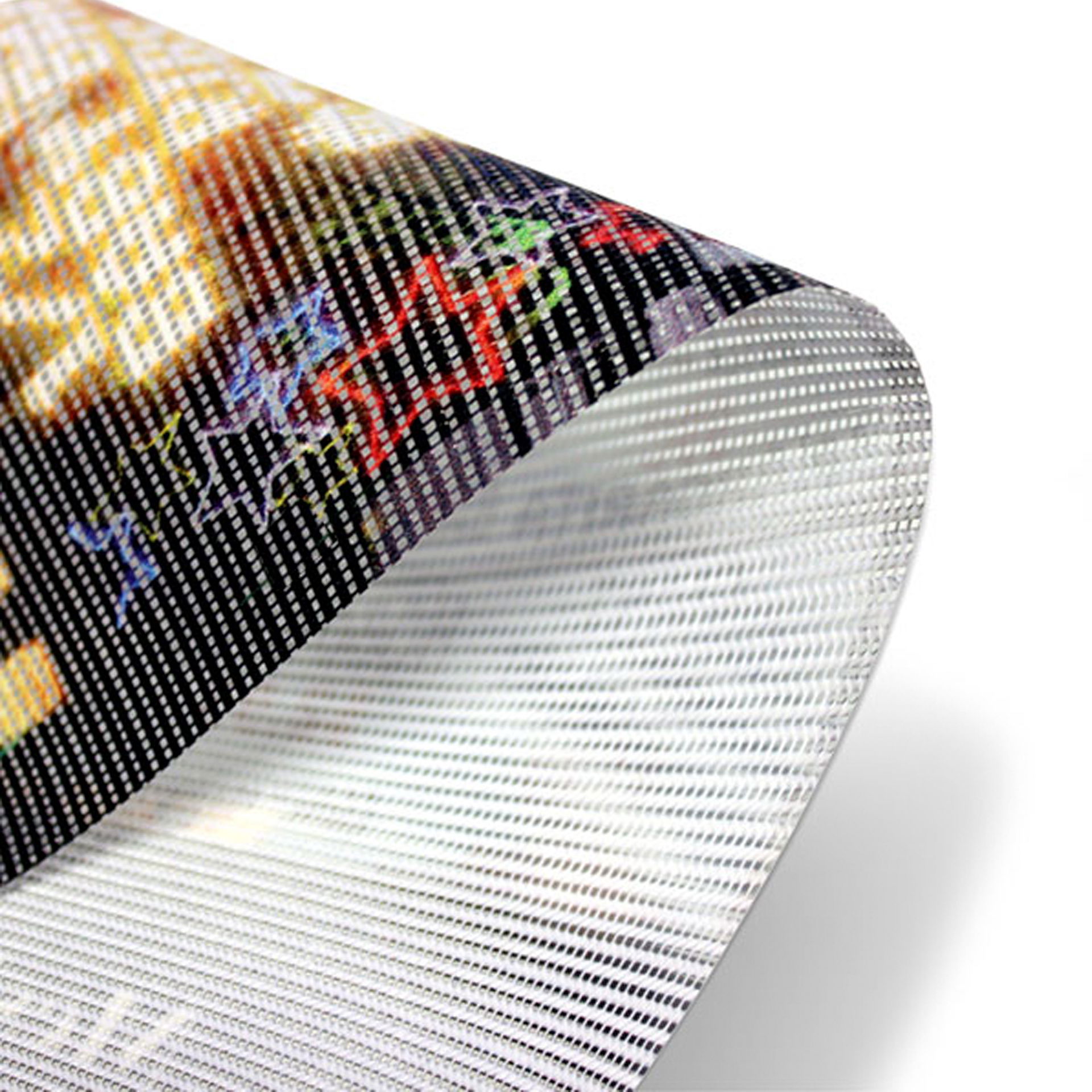 For våre stillasbannere bruker vi et materiale kalt mesh, som ligner på PVC-banner, bare med hull.