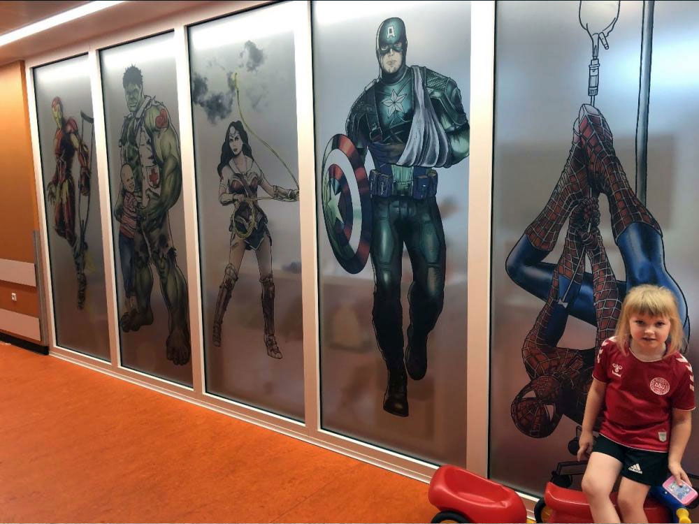 Selv superhelter som Spiderman og Ironman kan havne i trøbbel og ende på sykehuset. Det kan nå barna på Slagelse Sykehus se på barneavdelingen, hvor vi har sponset folie med tegninger av skadede superhelter. Tegningene er illustrert av Bianca og Annamaria Anhalts.