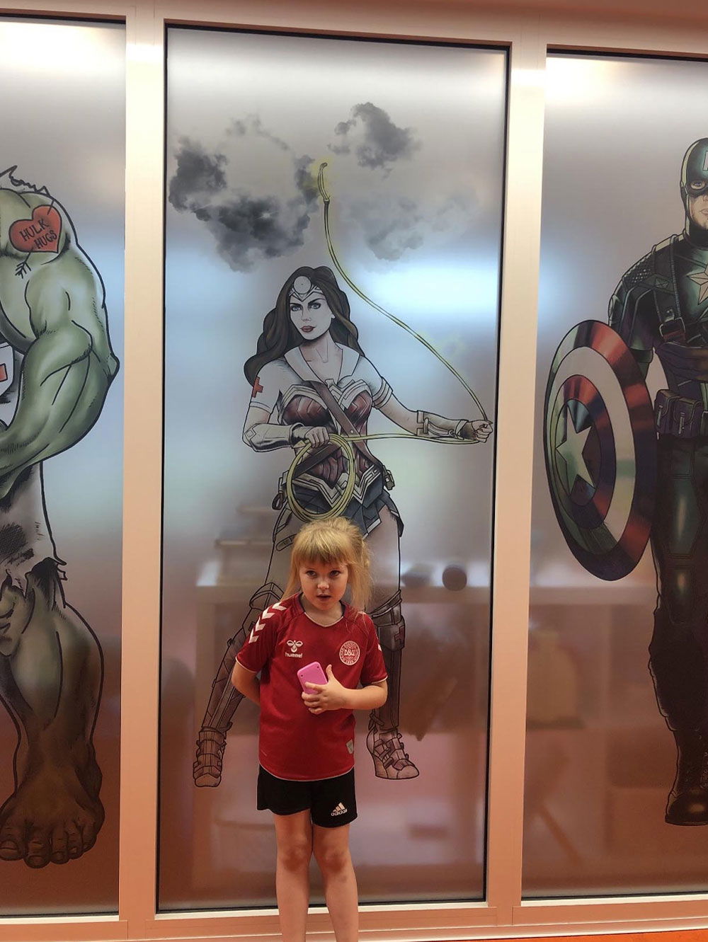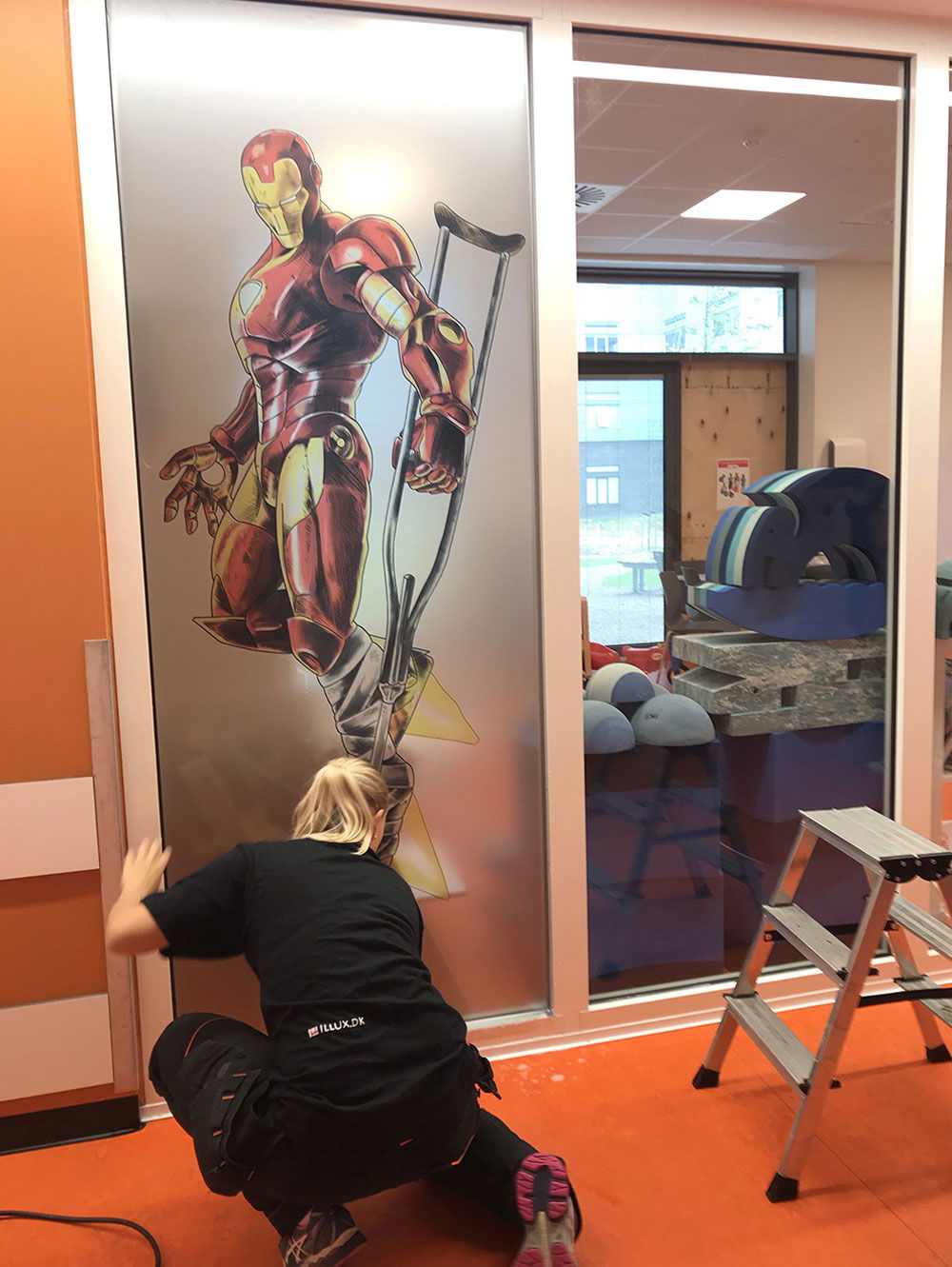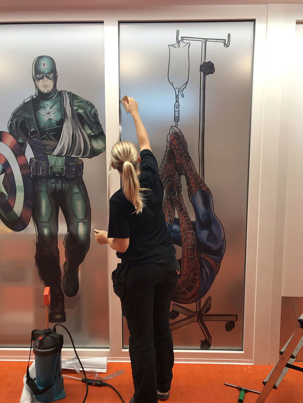 De sårede superheltene er printet på sandblåst (frostet) folie, slik at lyset slipper gjennom motivene – men uten at man kan se inn på pasientrommene. Det er også en fleksibel løsning, da folien enkelt kan fjernes når som helst.
