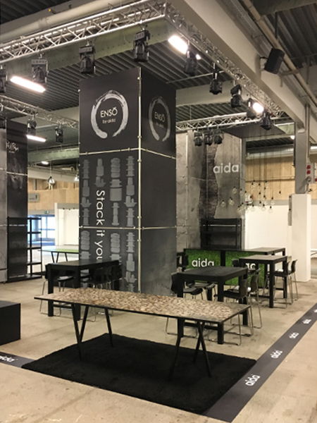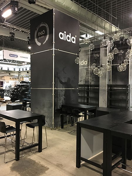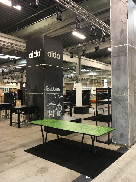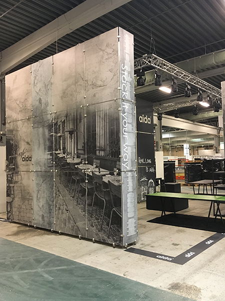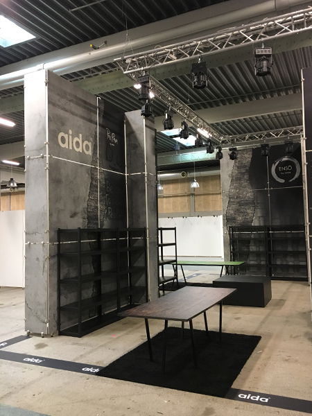 Messestanden er designet med et røft betongutseende som presenterer Aidas produkter på en flott og innbydende måte, i tråd med deres merkevare og design. Standen er moduloppbygd med 10 mm lettvektsplater og aluminiums-sammenføyninger, samt et vinyl messegulv.